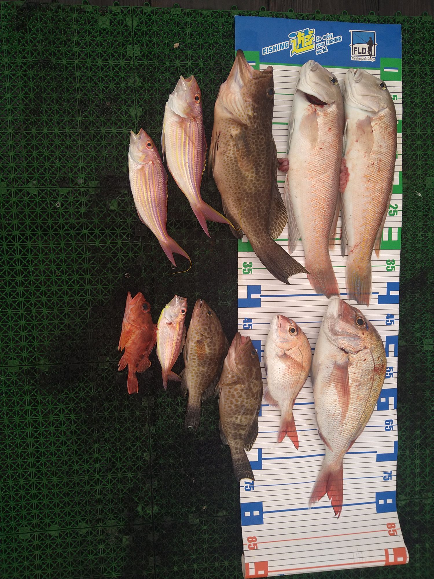 一投目でマダイ、2投目シロアマダイと後は交互にゲット、オオモンハタ、アオハタ、イトヨリダイと