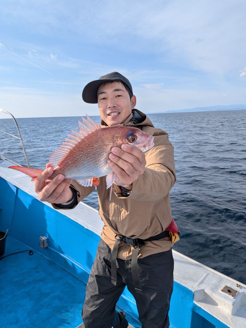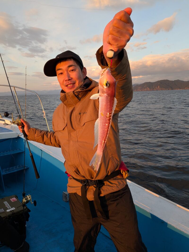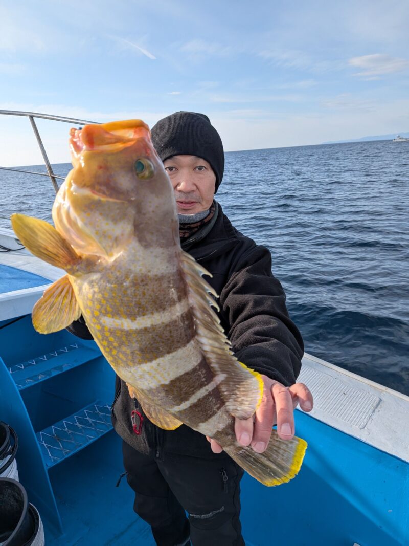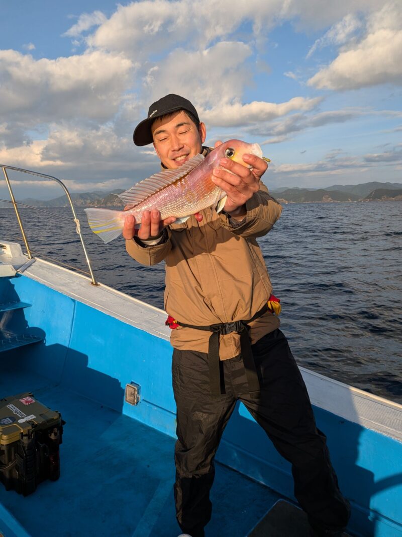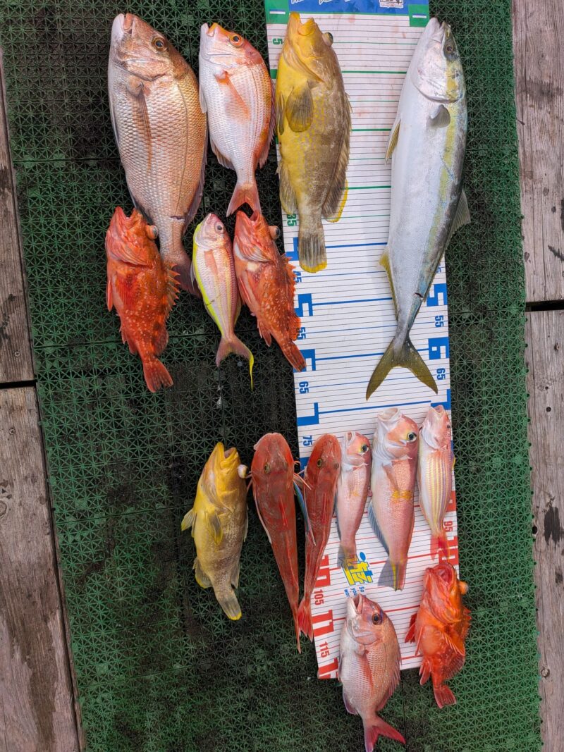 本年、乗船予約最終日、青物ワラサに始まり、本命アマダイ、マダイ、ウッカリカサゴ、アオハタ、ホウボウと6魚種のアオ、アカ、チャイロにピンク色の魚種多彩になりました。