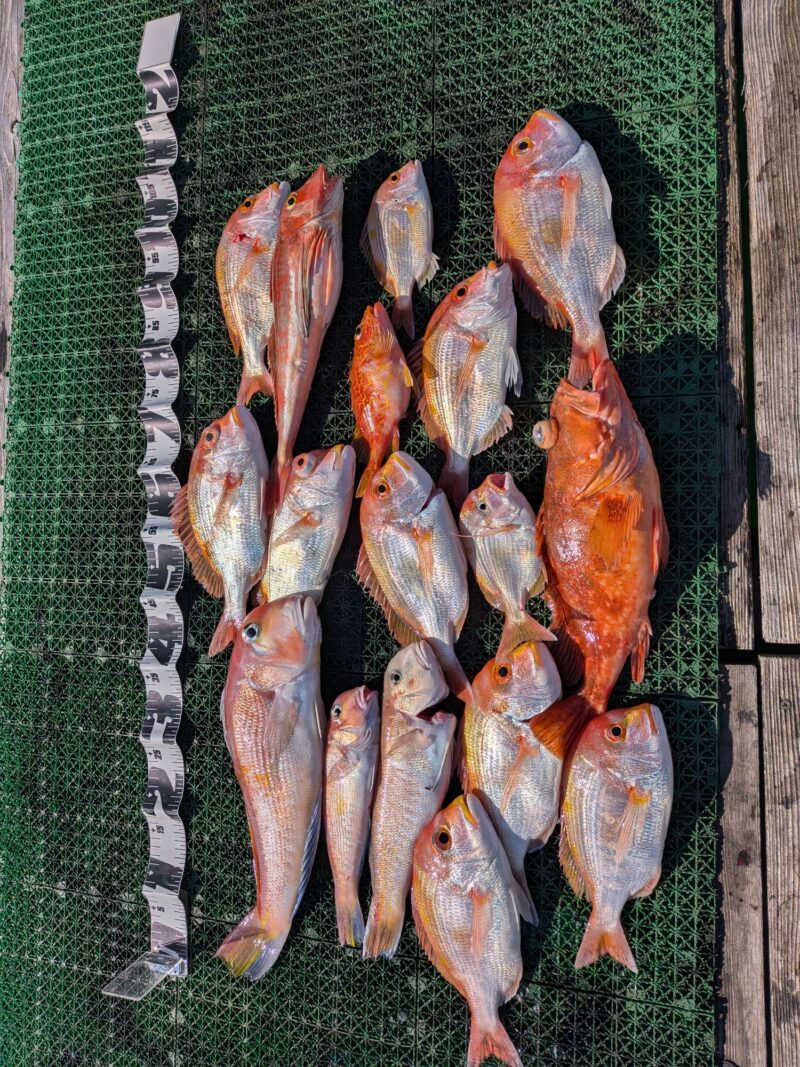 あまり良く無い条件の中、イルカの群れの歓迎から、高級魚の紅白アマダイに良型ウッカリカサゴとレンコダイ御一行様になりました。