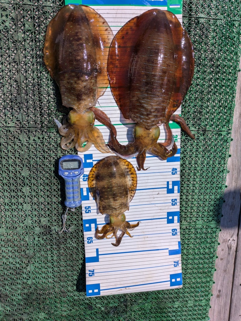 風収まったが、イカのアタリも収まっちゃった、大きいサイズ1,2キロ、1キロサイズ、後に報告両名、イカの足のみ2回有り